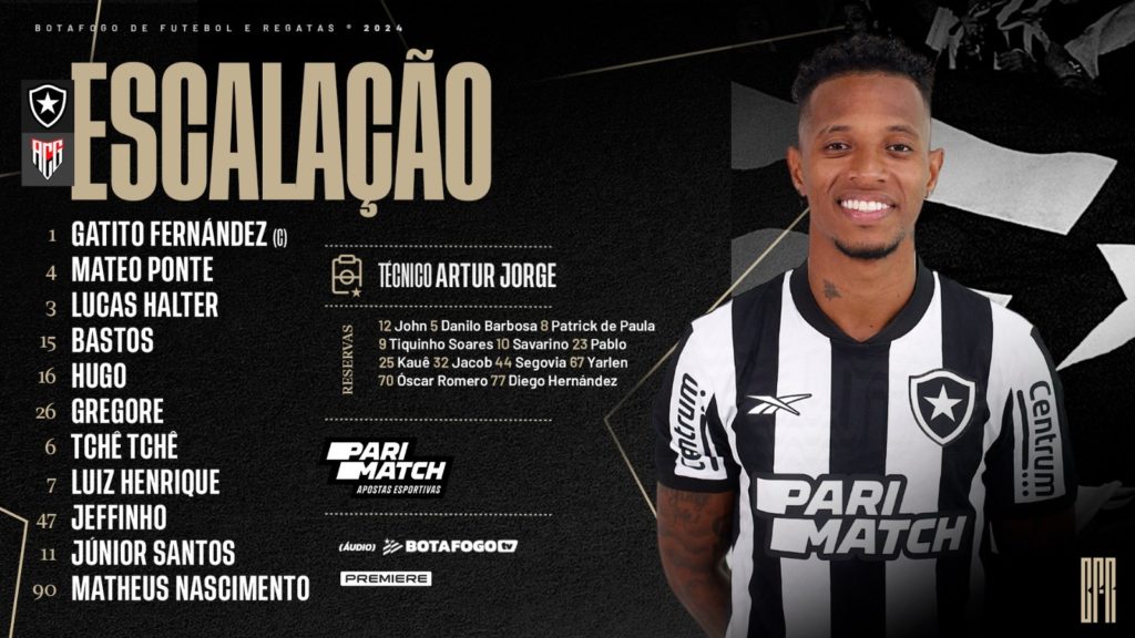 Artur Jorge definiu os onze que vão iniciar pelo Botafogo sua estreia no Estádio Nilton Santos e não colocou Tiquinho Soares entre os titulares. O treinador português faz sua terceira escalação diferente na terceira partida no comando do Alvinegro.