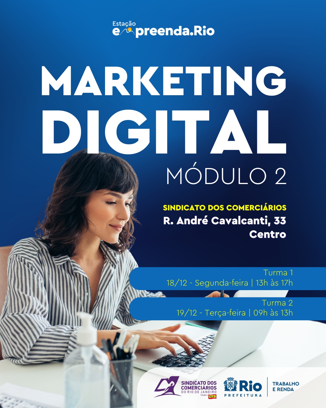 Como fazer anúncios online? Qual a importância das métricas no aperfeiçoamento e na ampliação dos negócios? Como usar o WhatsApp nas campanhas de marketing? A Prefeitura do Rio, por meio da Secretaria Municipal de Trabalho e Renda (SMTE), promove novo módulo do curso de marketing digital no Centro, nos próximos dias 18 e 19. Mas os candidatos devem se apressar, pois as vagas são limitadas. As inscrições podem ser feitas por meio do formulário https://forms.gle/v1KHTLC9gGs68RkB7.