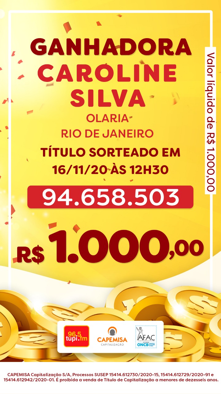 O primeiro sorteio desta segunda-feira, dia 16 de novembro, aconteceu às 12h30, dentro do programa Patrulha da Cidade. A ganhadora foi Caroline Silva (telefone: 21 96652-8xxx), moradora de Olaria, na Zona Norte do Rio. Ela faturou R$ 1 mil. O número do título sorteado foi: 94.658.503.