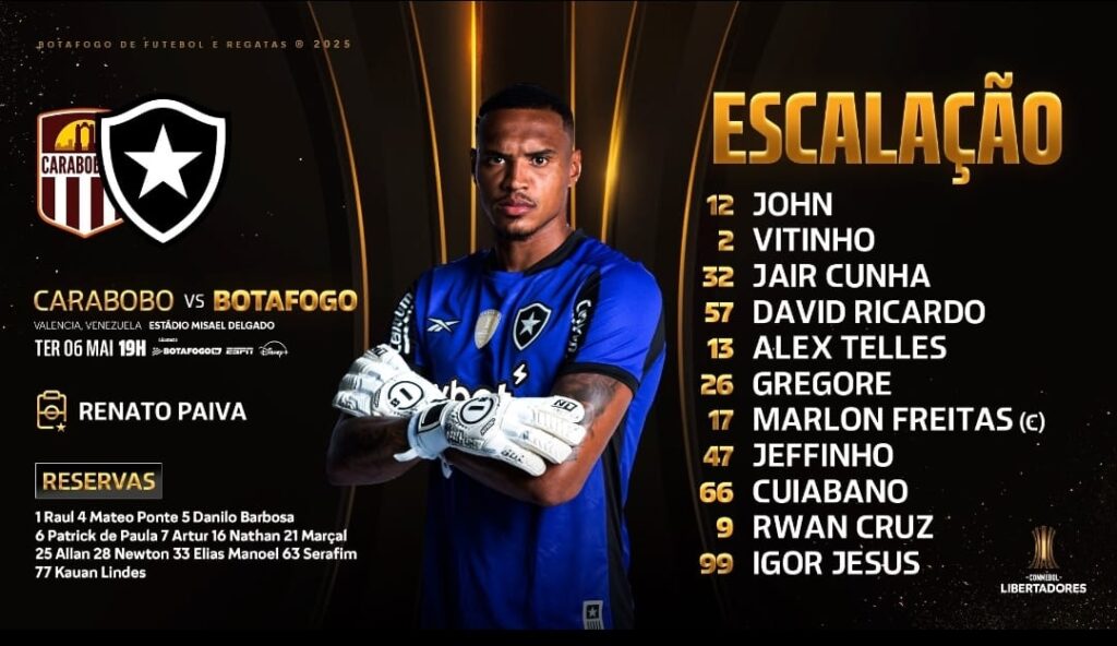 O Botafogo encara o Carabobo nesta terça-feira (6) pela quarta rodada da fase de grupos da Taça Libertadores. Confira as escalações abaixo: