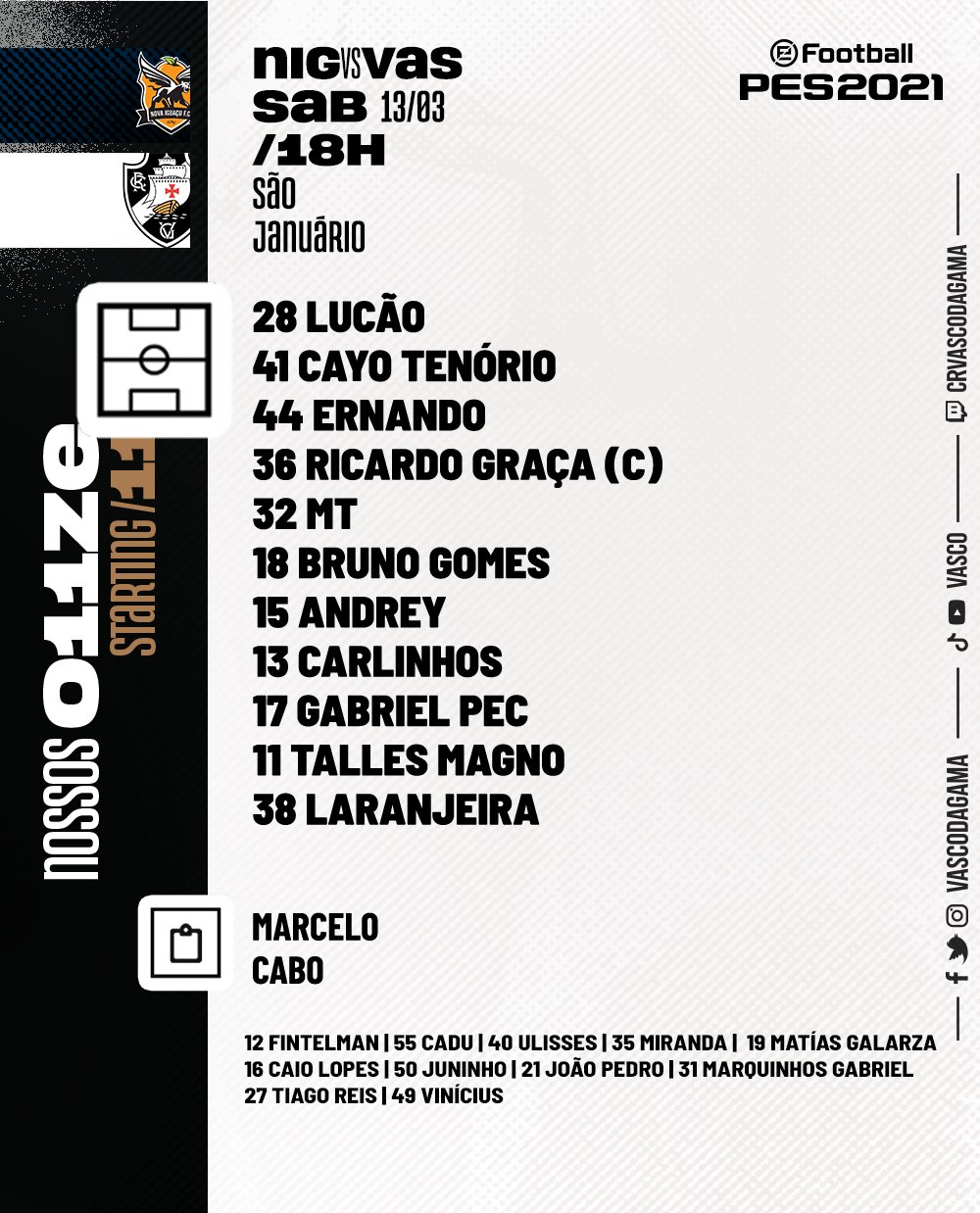 Confira as escalações de Nova Iguaçu e Vasco