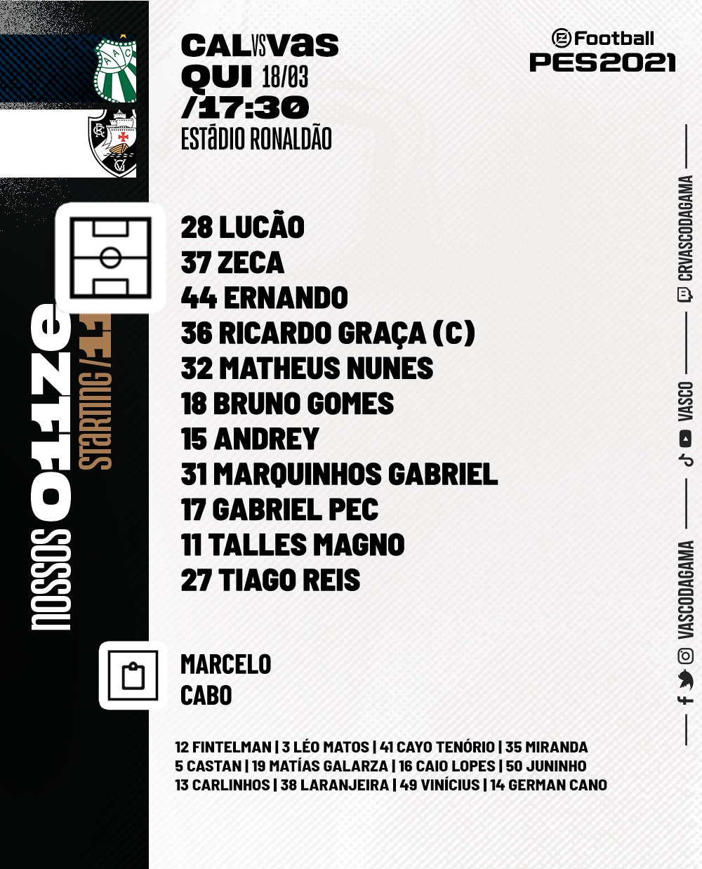 O Vasco da Gama entra em campo na tarde desta quinta-feira, enfrentando a Caldense no estádio Ronaldão em Minas Gerais, pela Copa do Brasil. A novidade da equipe de Marcelo Cabo é a presença de Tiago Reis na vaga de Germán Cano.