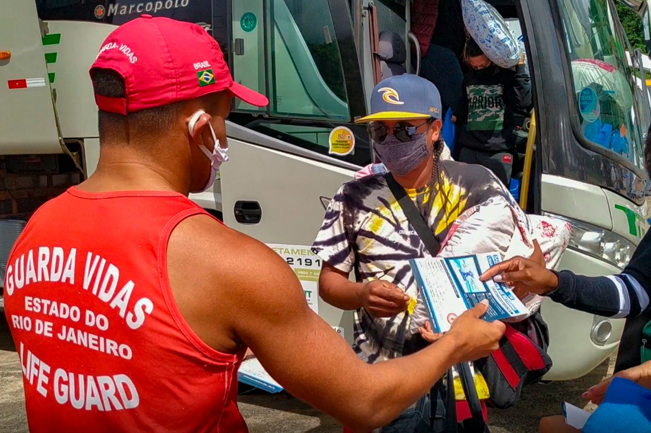 Recordista em número de salvamentos marítimos, o 18º GBM (Cabo Frio) adotou estratégias diferenciadas para prevenir afogamentos, especialmente, entre os turistas que chegam diariamente à cidade em ônibus de excursão. A abordagem preventiva acontece antes mesmo de os banhistas pisarem na areia: a orientação se dá no interior dos veículos que estacionam no terminal local.