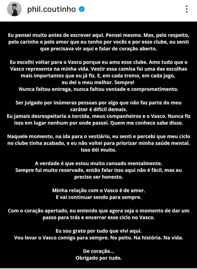 Nesta quarta-feira (18), o meia Philippe Coutinho confirmou que está de saída do Vasco e negocia a rescisão do contrato com o Cruzmaltino. O vínculo do jogador com o clube ia até julho deste ano, mas ambas as partes devem rompê-lo antes do previsto a pedido do atleta.