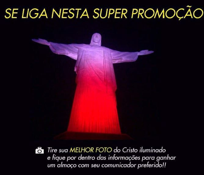 Em comemoração, a rádio mais amada do Brasil está realizando uma Super Promoção para os ouvintes. Quem tirar a melhor foto do cristo iluminado com as cores da Tupi e enviar nesta sexta-feira (25), às 19h, para o número 980188886, poderá ganhar R$ 1 mil em compras no supermercado MegaBox.