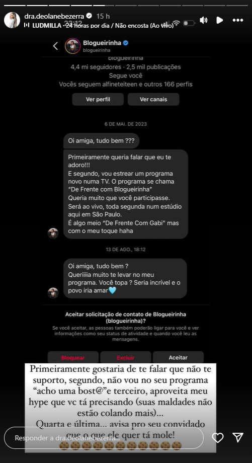 Sem demora, Deolane Bezerra expressou sua desaprovação através de suas redes sociais. Ela criticou o programa, recusando-se a participar e rebatendo os comentários feitos. Além disso, ela compartilhou uma conversa anterior na qual havia sido convidada para a atração, enfatizando a falta de resposta à proposta inicial. Veja: