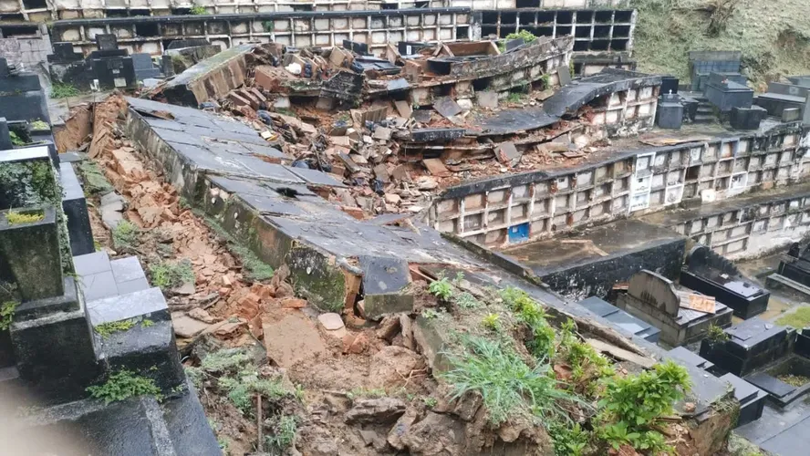 Um desabamento atingiu o Cemitério Municipal do Centro de Petrópolis neste sábado (23). Devido às fortes chuvas que atingem o município desde a sexta-feira (22), o setor 9 do cemitério não resistiu ao acúmulo de água e colapsou, atingindo gavetas de sepultamento.
