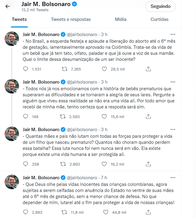 Jair Bolsonaro criticou a decisão da justiça colombiana e disparou: "Lutarei até o fim para proteger a vida de nossas crianças"