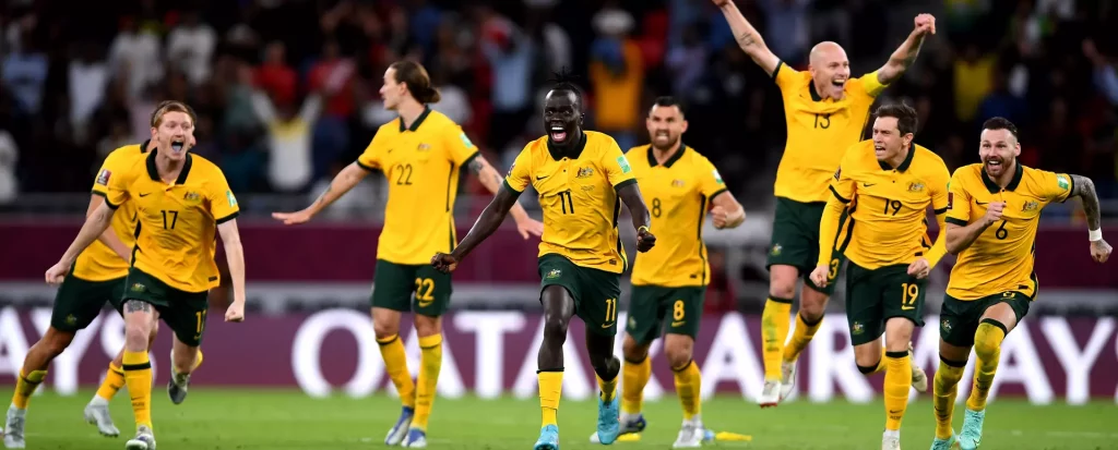 Bem diferente da bandeira, que tem como referências as cores alusivas ao Reino Unido, o uniforme da Austrália no futebol e em outros esportes é amarelo e verde. O amarelo faz referência às praias, à riqueza mineral, às safras de grãos e ao novelo de lã.