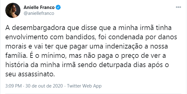 Nas suas redes sociais, a irmã de Marielle, Anielle Franco escreveu que a decisão é o mínimo, mas não paga o preço de ver a história de Marielle sendo deturpada dias após o seu assassinato.