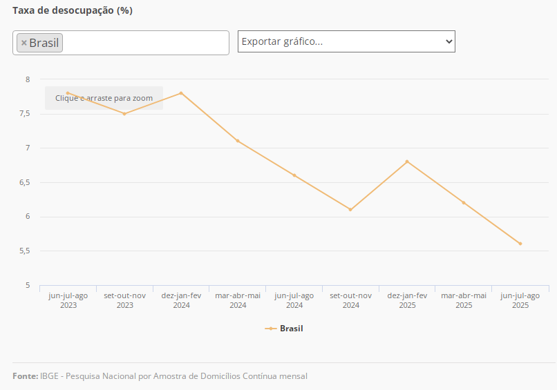 Com o resultado, são 6,1 milhões de pessoas desocupadas no país no trimestre até agosto, o menor contingente da série, que caiu 9,0% (menos 605 mil pessoas) frente ao trimestre até maio. Em relação ao mesmo período de 2024, a queda foi de 14,6% (menos 1,0 milhão de pessoas).