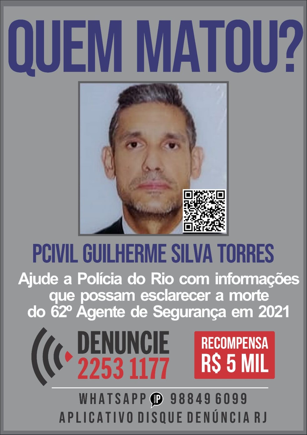 O Portal dos Procurados divulgou um cartaz, oferecendo recompensa de 5 mil reais, para quem ajudar a polícia a prender os assassinos do inspetor da polícia civil, Guilherme Silva Torres, de 47 anos, assassinado a tiros por bandidos da localidade do karatê, na Cidade de Deus, nesta terça-feira.