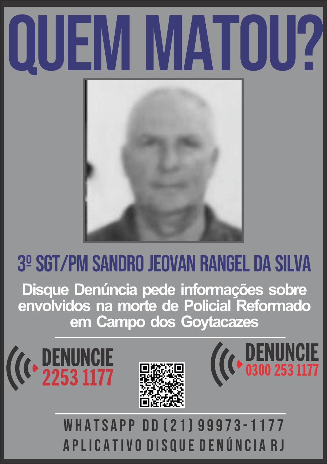 O Disque Denúncia, divulga neste domingo (23), um cartaz para ajudar no inquérito instaurado pela 134ª DP (Campo dos Goytacazes), a fim de obter informações que possam levar à identificação e prisão dos envolvidos na morte do 3º Sargento Reformado da Polícia Militar do Rio de Janeiro, Sandro Jeovan Rangel da Silva. Ele foi morto a tiros, na tarde da última sexta-feira (21), no bairro Baixa Grande, às margens da RJ-216, em Campos dos Goytacazes, no Norte Fluminense.
