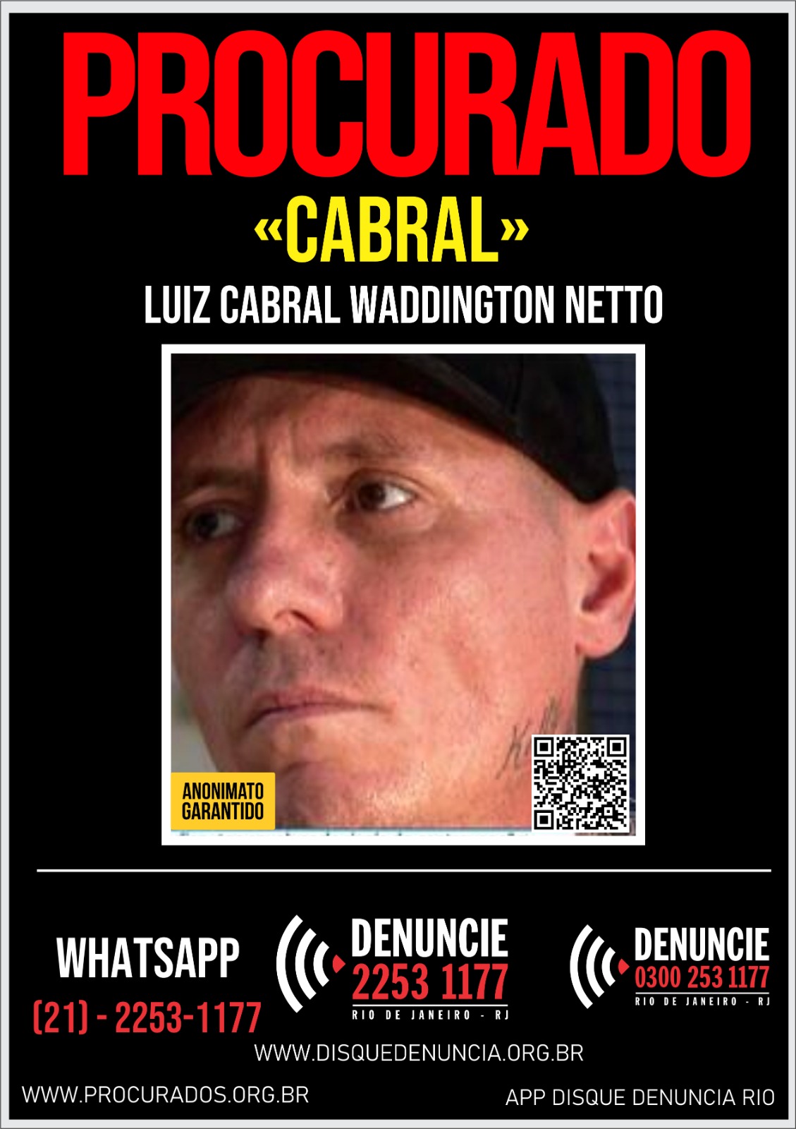 O Disque Denúncia divulgou um cartaz em busca de informações sobre a localização do contraventor Luiz Cabral Waddington Neto, de 42 anos, suspeito de ser o mandante de um ataque a um bar em Vila Isabel, na Zona Norte do Rio, em que duas pessoas ficaram feridas.