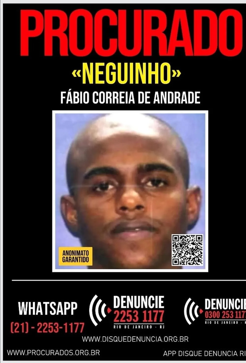 O Disque Denúncia divulgou um cartaz pedindo informações sobre o paradeiro do traficante Fábio Corrêa de Andrade, conhecido como Neguinho, que seria o responsável por cobranças de taxas de gás, “gatonet” e segurança na comunidade Boog Woogie, na Ilha do Governador, Zona Norte do Rio.