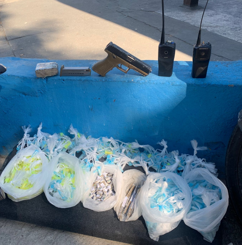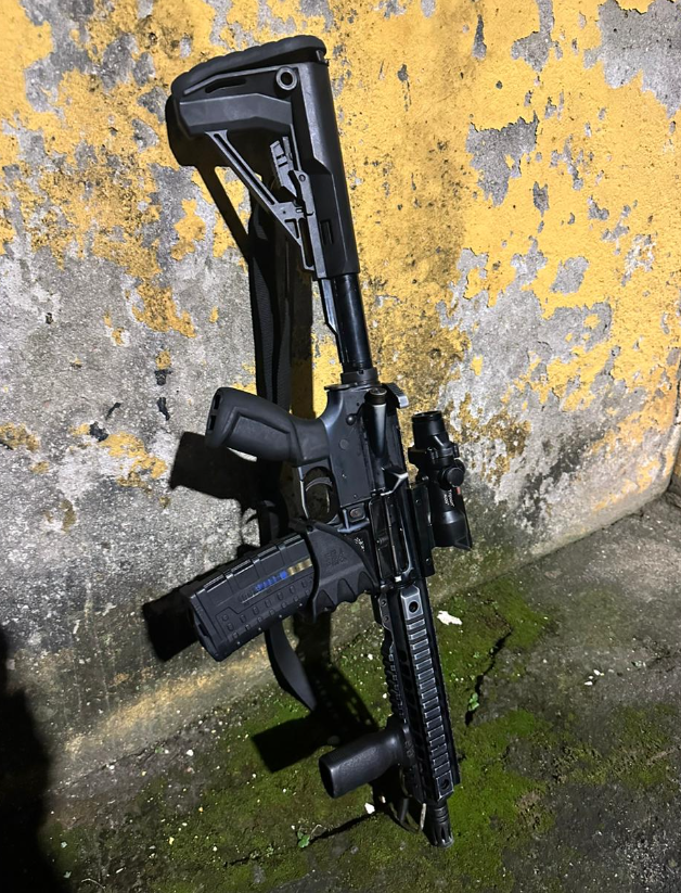 Até o momento, 01 fuzil cal. 5,56, 01 pistola equipada com kit rajada, carregadores e diversas drogas foram apreendidas.