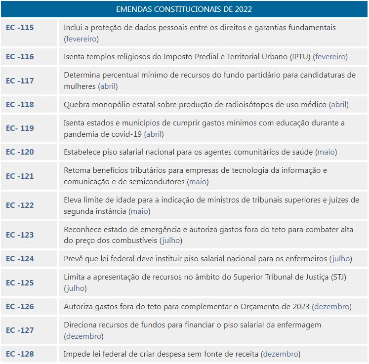 Destaque para a diversidade de padrão temático. As emendas publicadas em 2022 tocam em vários assuntos, como tributação, regras eleitorais, orçamento, administração pública e direitos trabalhistas. Nenhuma delas, no entanto, veio do Poder Executivo.