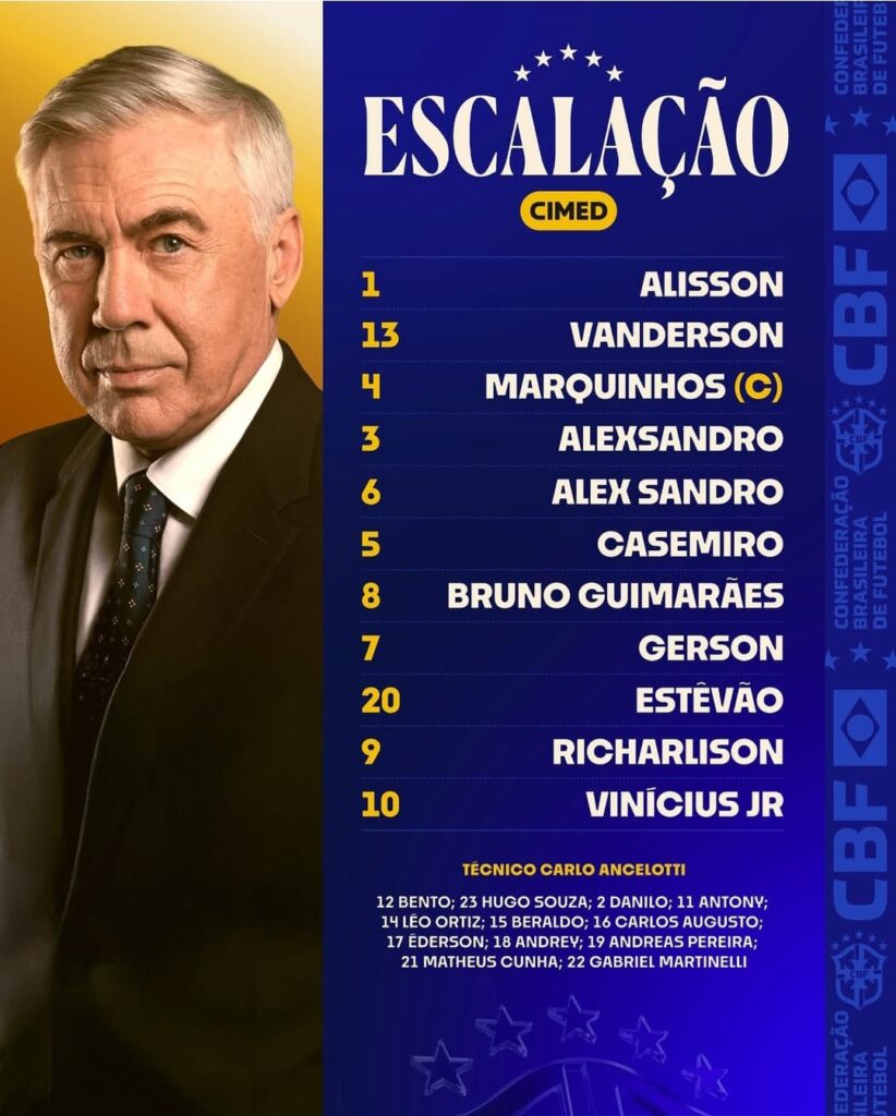 O técnico Carlo Ancelotti escalou pela primeira vez a seleção brasileira. Na primeira partida à frente da Amarelinha, o italiano mexeu em algumas posições e vai promover a estreia de Alexsandro Ribeiro com a camisa da seleção.