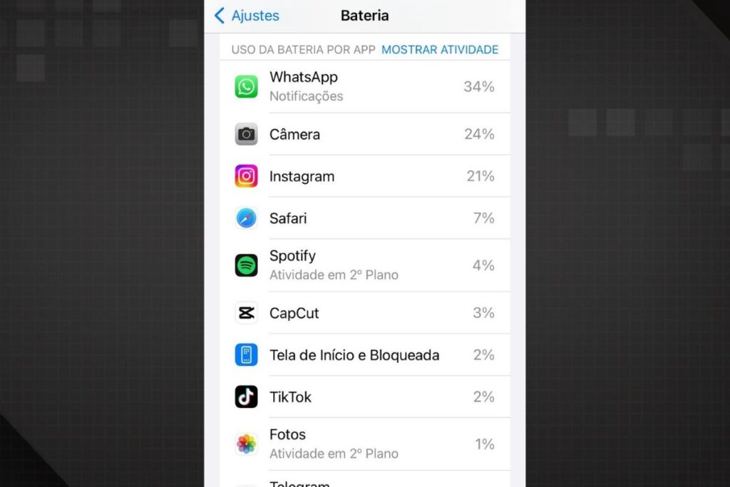 Ajustes → Bateria, onde o sistema lista o percentual de consumo de cada aplicativo.