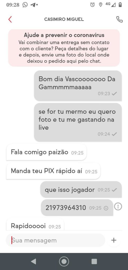 O entregador de delivery Thiago Koller, postou numa rede social o relato de um encontro um tanto quanto inesperado. O streamer e influencer Casimiro deixou o rapaz incrédulo ao fazer um pix de mil reais. A gorjeta foi dada após o rapaz reconhecer o nome de “Cazé” no aplicativo e mandar mensagem.
