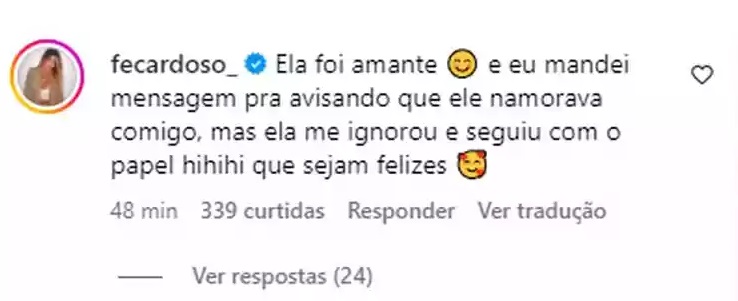 “Ela foi amante, e eu mandei mensagem pra ela avisando que ele namorava comigo, mas ela me ignorou e seguiu com o papel hihihi que sejam felizes”, comentou Fernanda em uma publicação no Instagram.