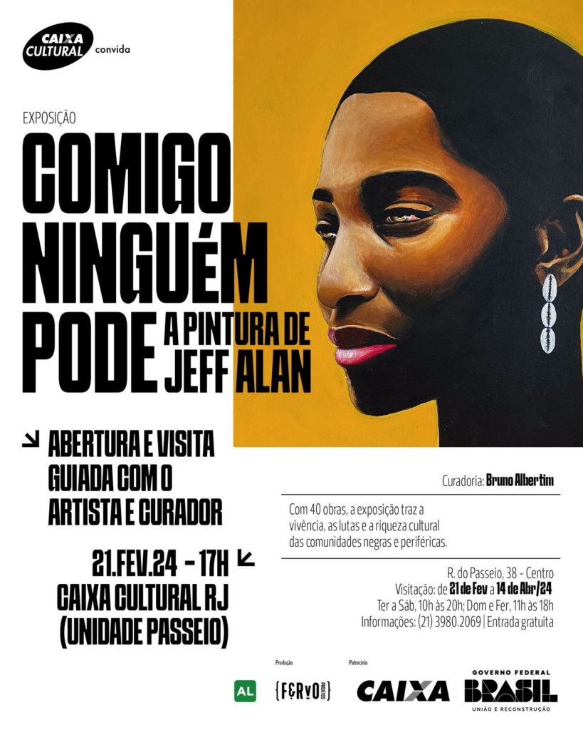 Vista por 85 mil pessoas em uma curta temporada de três meses, na Caixa Cultural Recife, a exposição individual “Comigo Ninguém Pode – A pintura de Jeff Alan”, exibe as feições, texturas e tons retintos de personagens reais do cotidiano popular do Recife, retratados em 40 obras do artista visual pernambucano que nasceu e cresceu no Barro, na periferia da capital pernambucana.