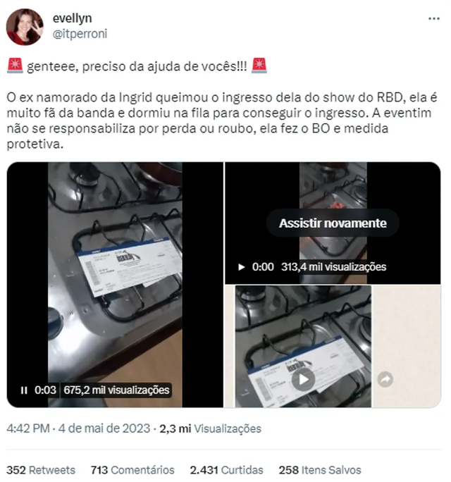 Em janeiro de 2023 a banda RBD anunciou uma nova turnê após 15 anos, com shows também no Brasil. Os fãs surtaram: teve briga nas filas, acampamento e até luta por ingressos. Porém, desta vez, uma fã do grupo viralizou por conta de um ingresso que foi queimado pelo ex-marido.