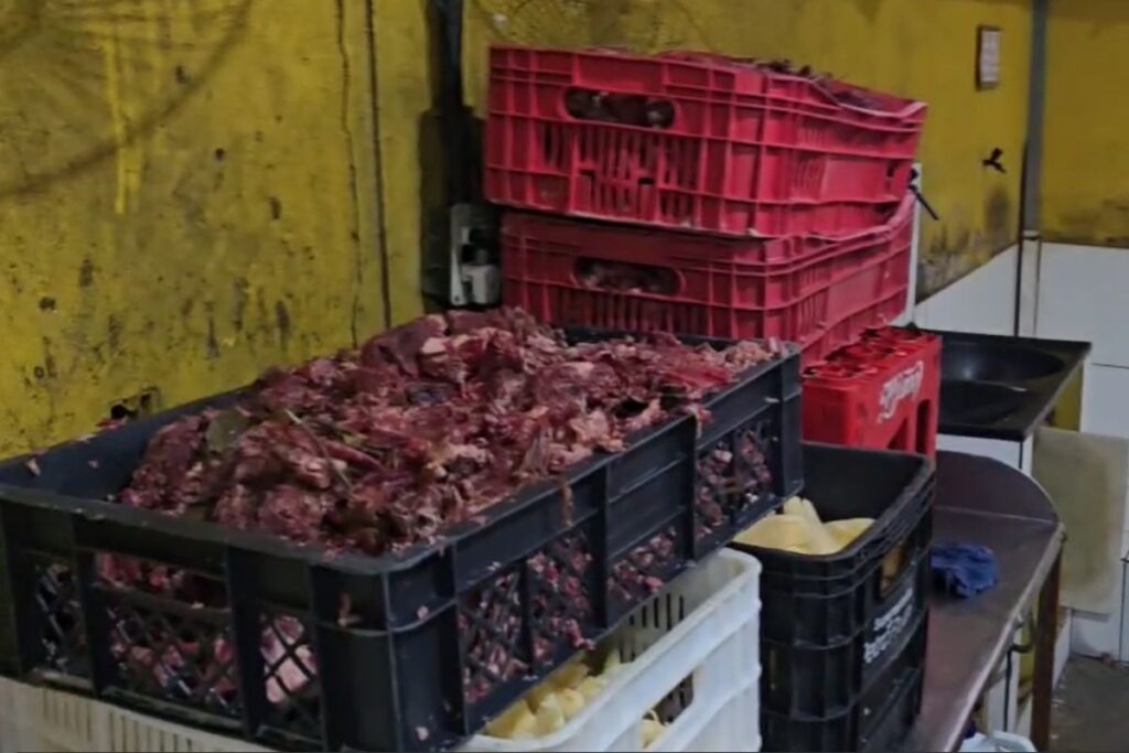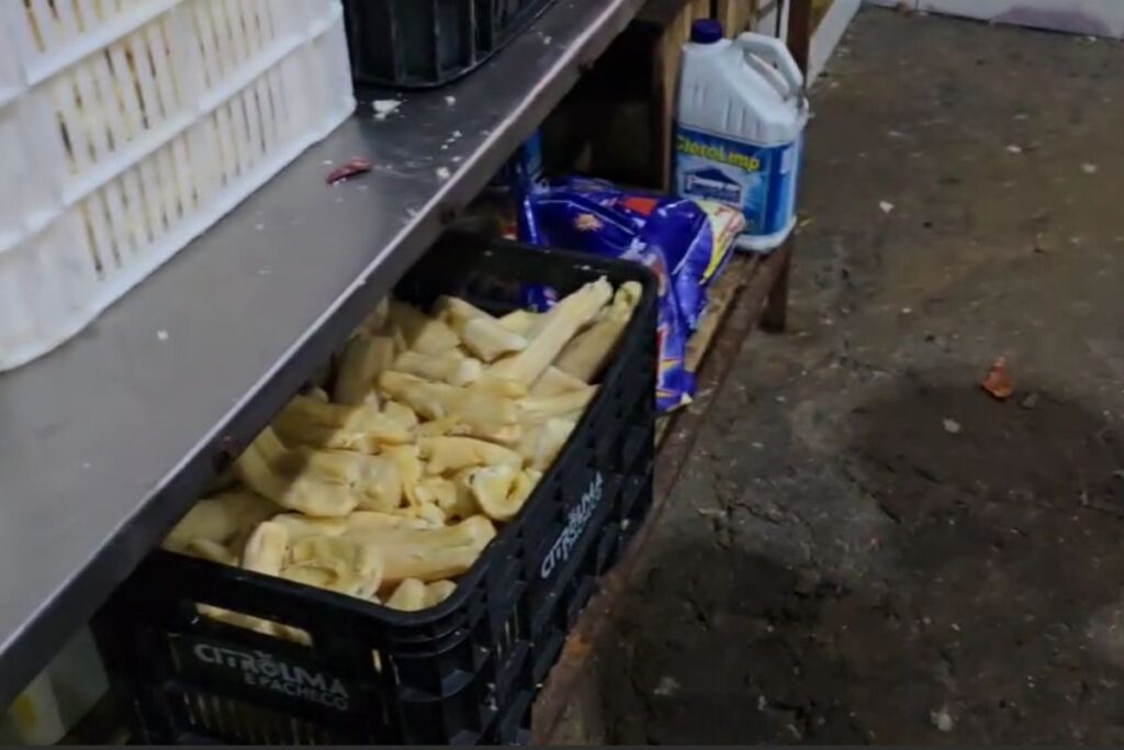 “Mais de 600 kg de alimentos, incluindo salgado de carne, carne seca, kibe, pastel… tudo isso foi apreendido e descartado porque era impróprio ao consumo. A falta de higiene chamou muita atenção. A gente encontrou rato, barata e muita mosca no local”, detalhou o delegado.