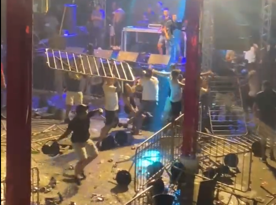 Ainda nas imagens, MC Cabelinho aparece deixando o palco cercado por seguranças.