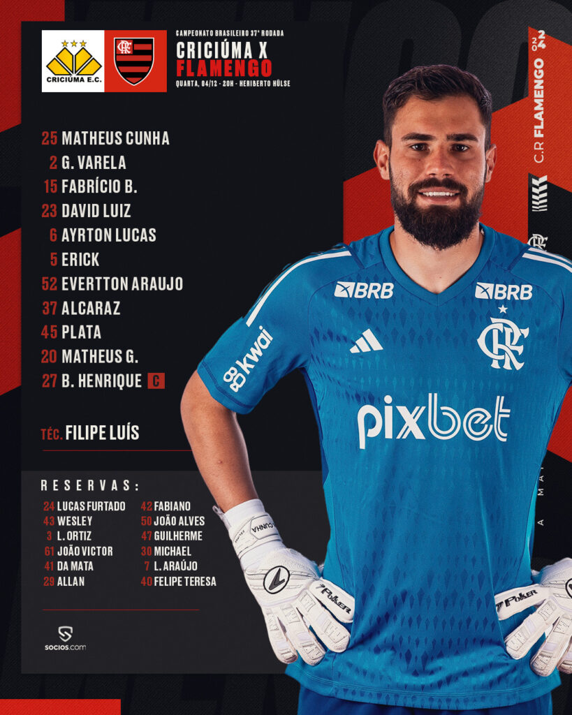 O Flamengo não vai jogar com o time titular contra o Criciúma, na noite desta quarta-feira (4). Com time reserva, Filipe Luís montou um esquema com 4-3-3 para enfrentar o Tigre.