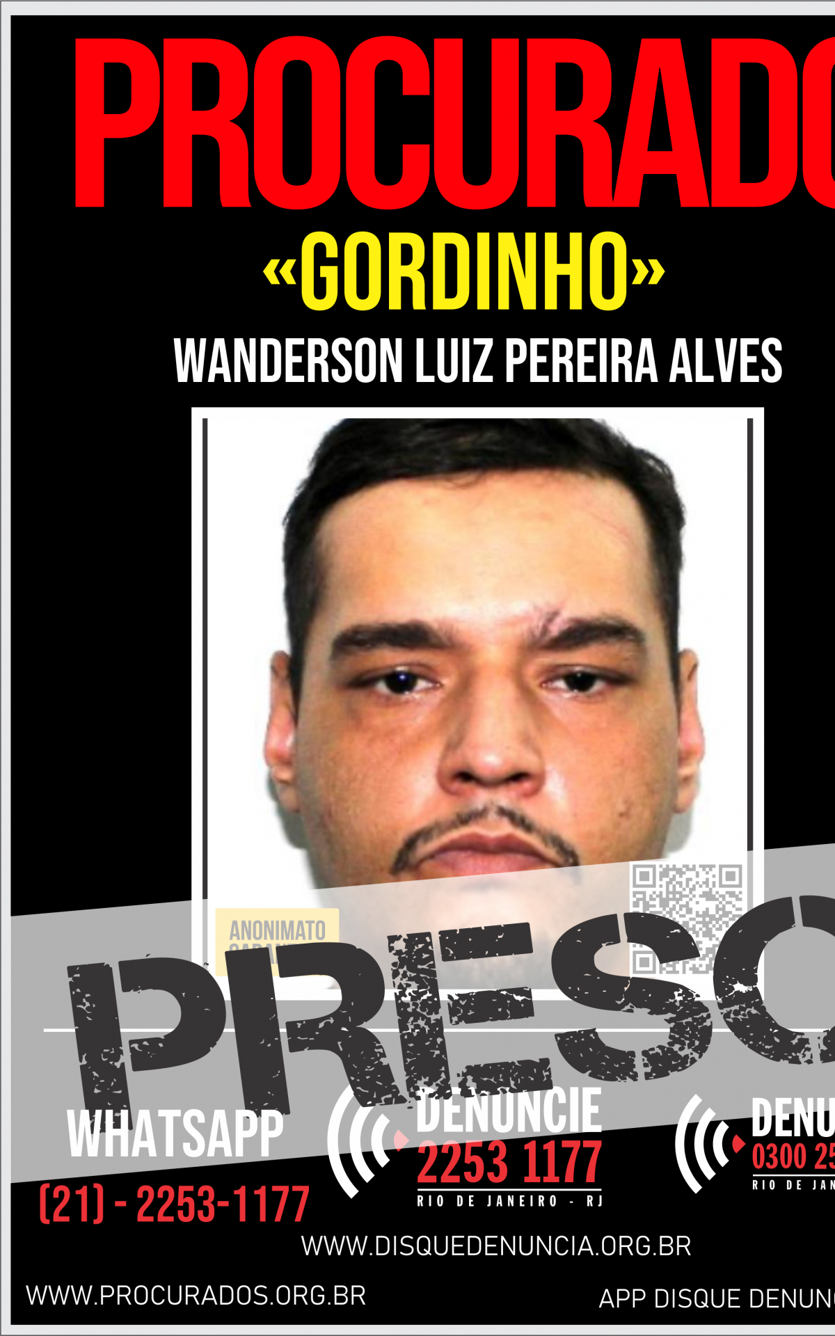 A Polícia Militar, com informações repassadas pelo Disque Denúncia, prendeu nesta terça-feira (11) Wanderson Luiz Pereira Alves, vulgo ‘Gordinho’, de 31 anos, em Rocha Miranda, na Zona Norte do Rio. Ele era considerado foragido da Justiça e estava em liberdade condicional.