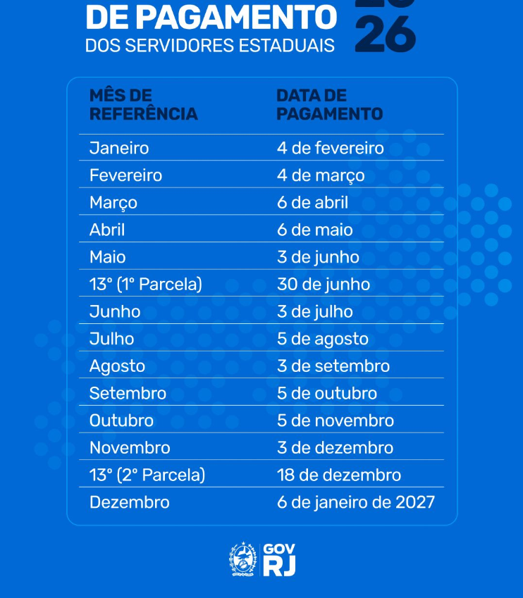 O Governo do Estado divulgou, nesta quarta-feira (17), o calendário de pagamento dos servidores do Poder Executivo para 2026. Os salários dos mais de 400 mil funcionários públicos ativos – incluindo comissionados-, aposentados e pensionistas continuarão a ser pagos no terceiro dia útil de cada mês, seguindo a regra estabelecida em 2022. A medida reforça o compromisso do governador Cláudio Castro com o funcionalismo, garantindo mais previsibilidade para todos os profissionais.