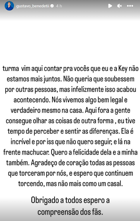 O ex-BBB Gustavo Benedeti anunciou o fim do relacionamento com a jogadora de vôlei, Key Alves, nesta terça-feira (4). O brother publicou nas redes sociais a confirmação do término e contou que foi quem optou pela separação.