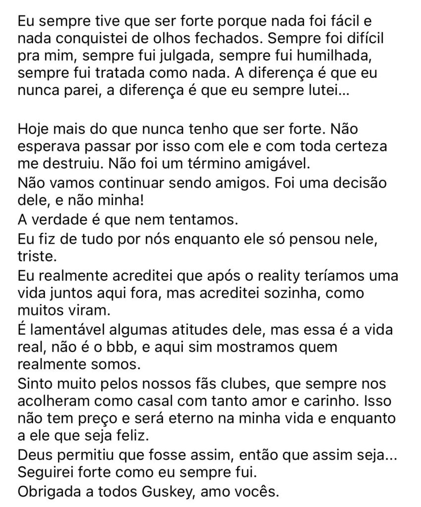“Primeiro a morte do meu avô enquanto eu estava confinada, depois a lesão gravíssima da minha irmã, e agora um término. Essa é a minha vida exposta em 2 meses para o mundo todo”, afirmou.