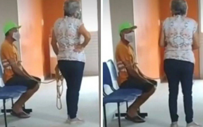 Nas imagens que circulam na web é possível ver o homem sentado em uma cadeira, com os braços presos a uma corda. A esposa, que está em pé, aparece segurando a corda, na frente dele.