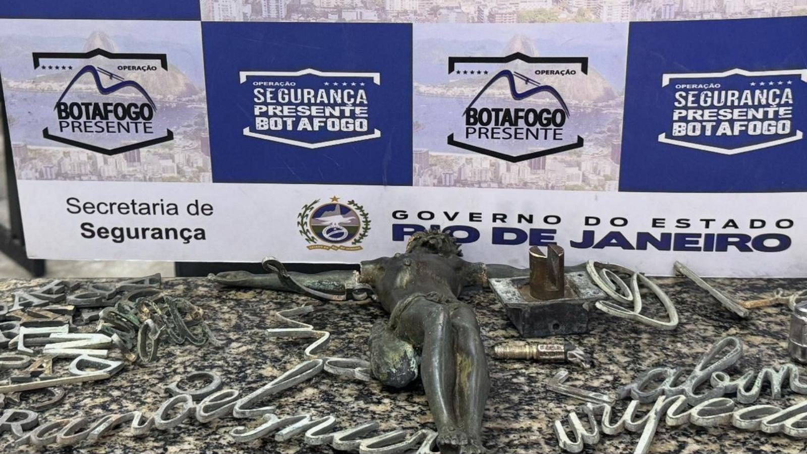 Agentes localizaram o suspeito após denúncia de morador e recuperaram peças de bronze furtadasAgentes da Operação Segurança Presente de Botafogo prenderam, nesta terça-feira (11), um homem suspeito de furtar uma imagem de Jesus Cristo em bronze do Cemitério São João Batista, na Zona Sul do Rio de Janeiro.