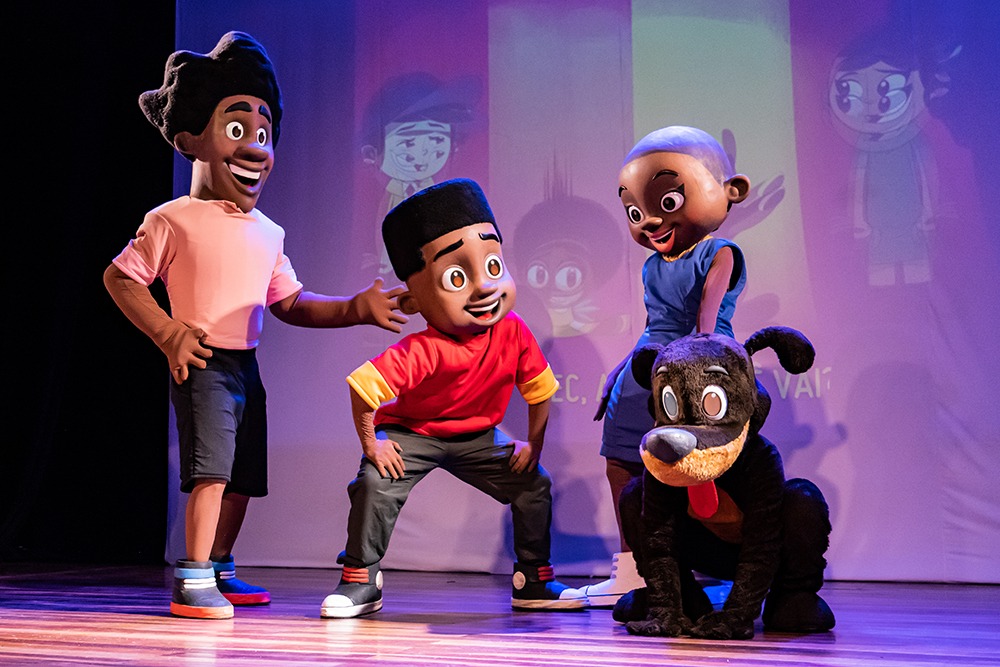 Para impactar ainda mais o olhar do público, foram confeccionados bonecos grandes, com cores fortes, como figurino para as personagens, contribuindo na construção de identidade das crianças. Os bonecos garantem, junto aos outros estímulos, uma explosão dos sentidos visuais e auditivos. Os atores interpretam os personagens dublando as vozes de seus intérpretes originais no desenho animado, como Emicida, David Junior e Yasmin Garcez, entre outros. As linguagens se misturam num espetáculo único e estimulador do imaginário de toda a família, mas, especialmente, do infantil.