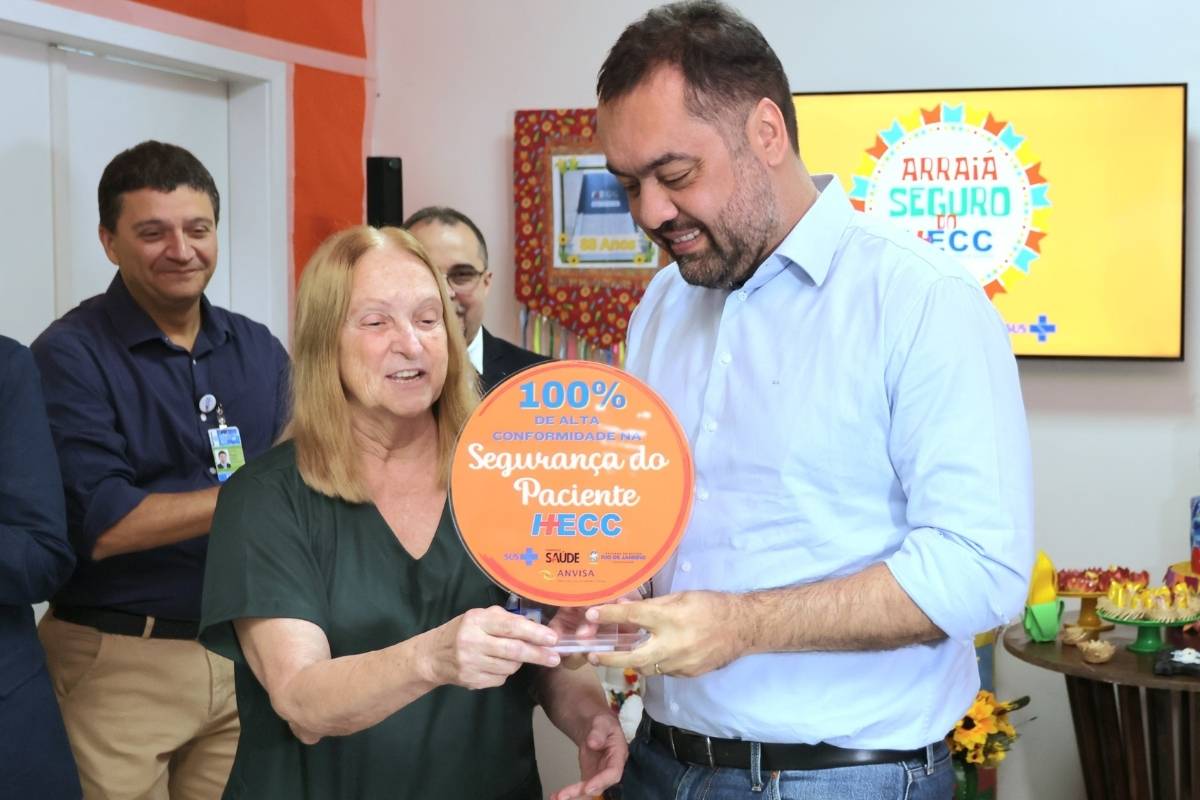 A médica Walkiria Cipolla, funcionária há 50 anos no hospital, entregou ao governador o prêmio de 100% de conformidade na segurança do paciente, recebido pela unidade.