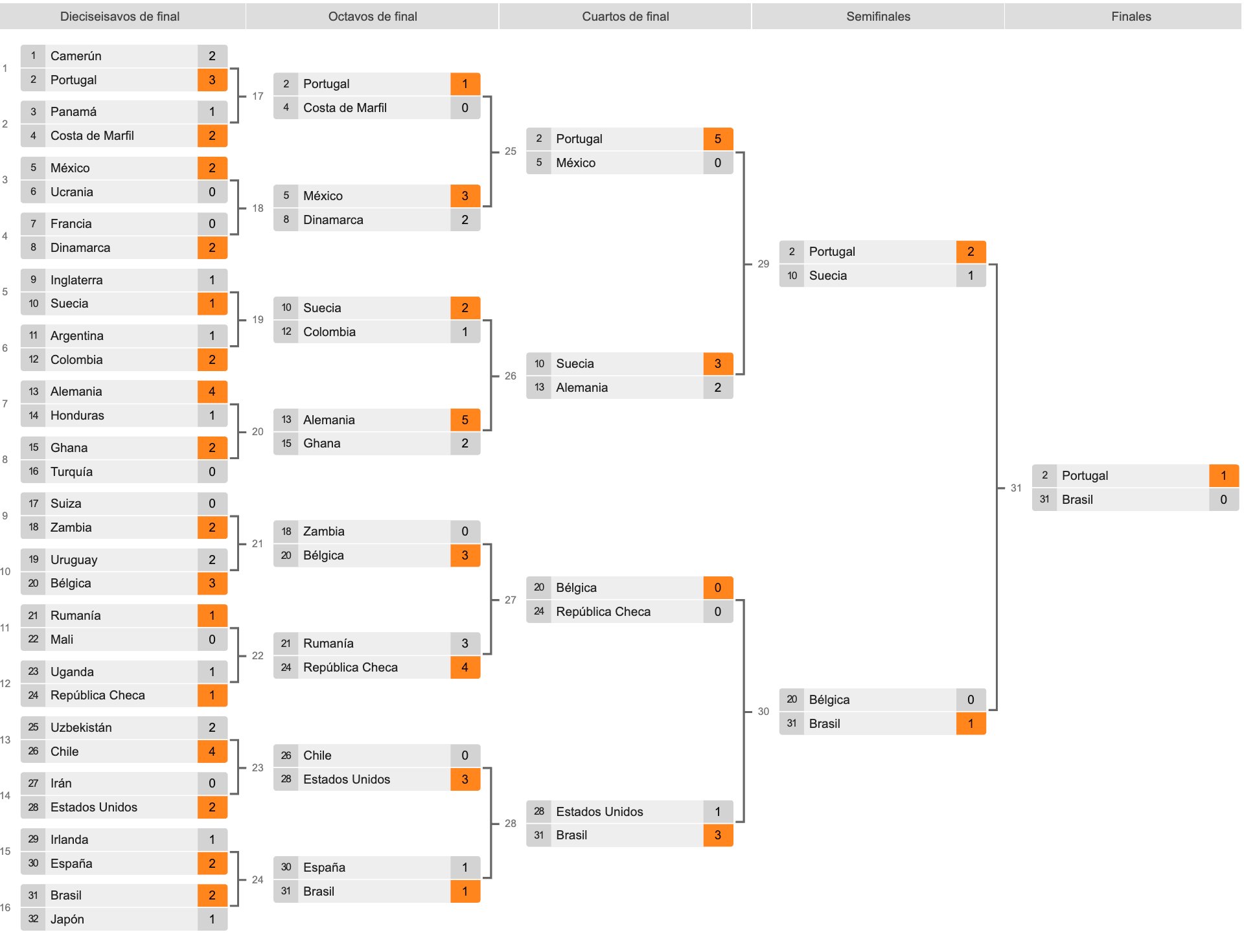 Após passar pela fase de grupos, Portugal encararia Camarões nos 16 avos de final, ganhando por 3 a 2. Nas oitavas, o adversário seria a Costa do Marfim e os lusos ganhariam por 1 a 0. Posteriormente, já nas quartas, uma goleada sobre um dos donos da casa, o México, por 5 a 0. Já na semifinal, o destino colocaria a equipe de Cristiano Ronaldo frente a frente com a Suécia, num triunfo de 2 a 1.