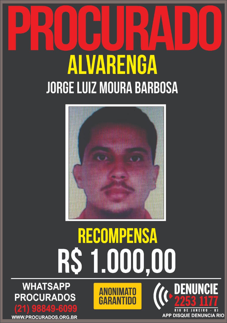 O Portal dos Procurados do Disque Denúncia divulgou um cartaz pedindo informações que levem à prisão de Jorge Luiz Moura Barbosa, de 41 anos, conhecido como Alvarenga do Parque União. Além de tráfico de drogas, ele também é acusado de homicídio qualificado e ocultação de cadáver. Segundo as investigações, Jorge Luiz é apontado como um dos chefes do tráfico na favela, que fica no Complexo da Maré, na Zona Norte da Cidade, e costuma promover bailes funks com a finalidade de aumentar as vendas de drogas na região.