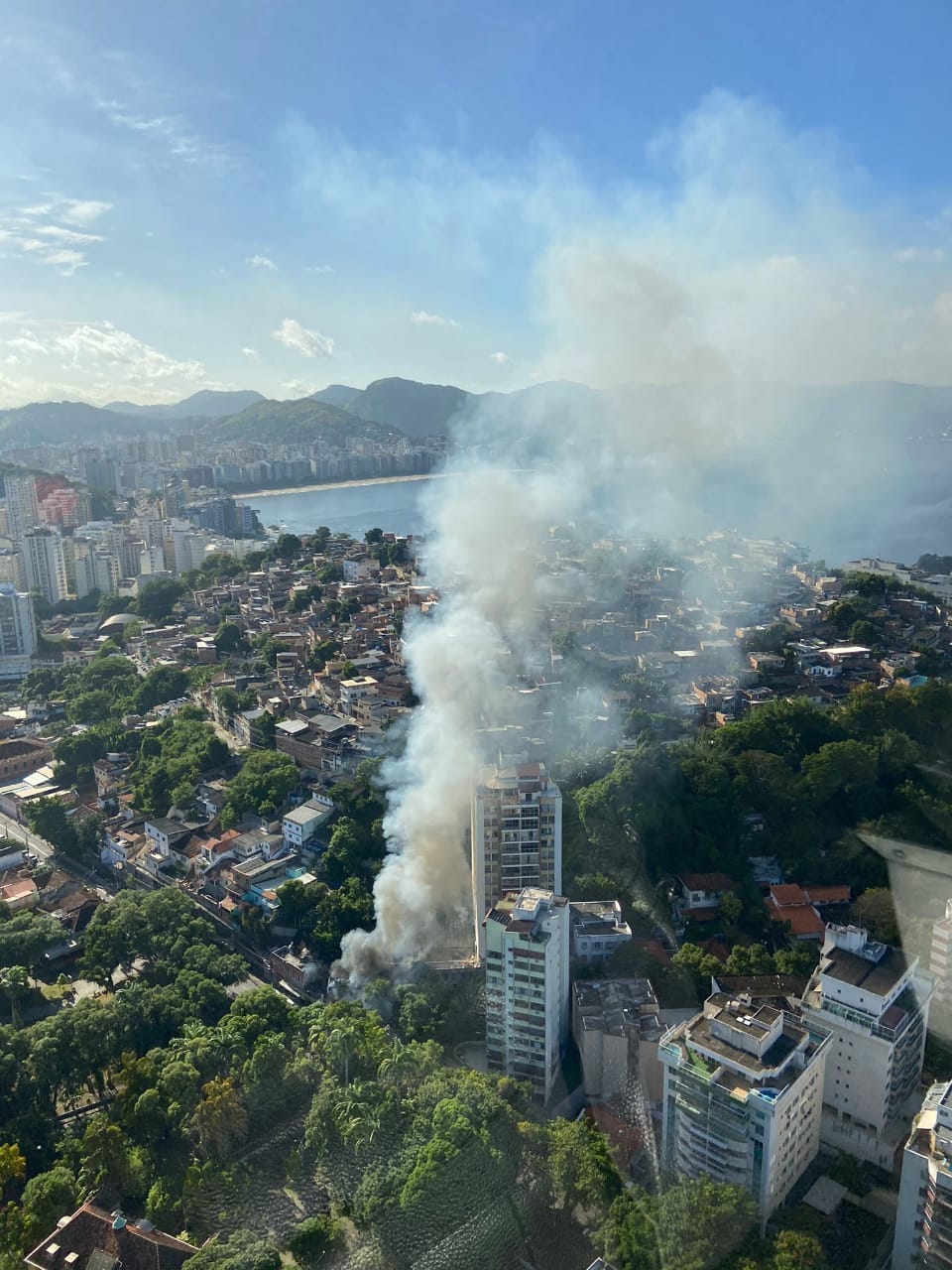 Os agentes continuam no local para conter as chamas que podem ser vistas da Baía de Guanabara.