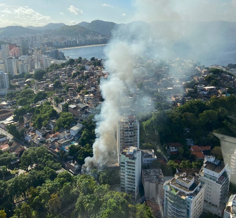 Os agentes continuam no local para conter as chamas que podem ser vistas da Baía de Guanabara.
