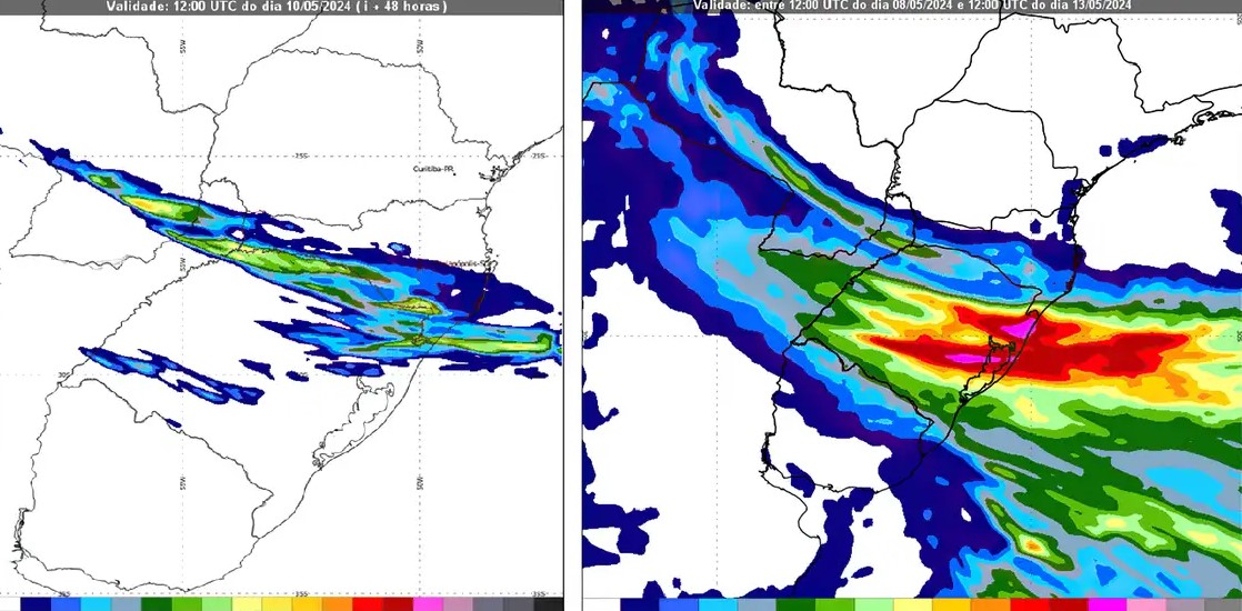 “Neste período, os volumes de chuva podem passar dos 100 milímetros (mm). Ainda conforme a previsão, os ventos mudarão de direção e soprarão predominantemente de sul. Entre o fim do domingo (12) e a segunda-feira (13), as rajadas variam de oeste a sul e depois de sul, com velocidade acima de 30 km/h. Já na terça-feira (14), os ventos enfraquecem”, informou o instituto.