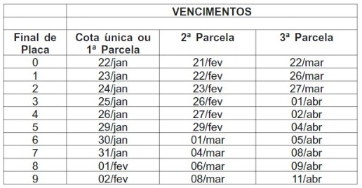 Pagamento deverá ser feito em cota única, com desconto de 3% se efetuado até a data de vencimento, ou em três parcelas mensais