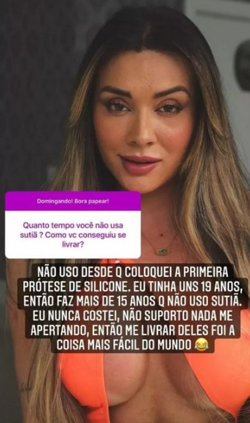 “Não uso desde que coloquei a primeira prótese de silicone. Eu tinha uns 19 anos, então faz mais de 15 anos que não uso sutiã”,