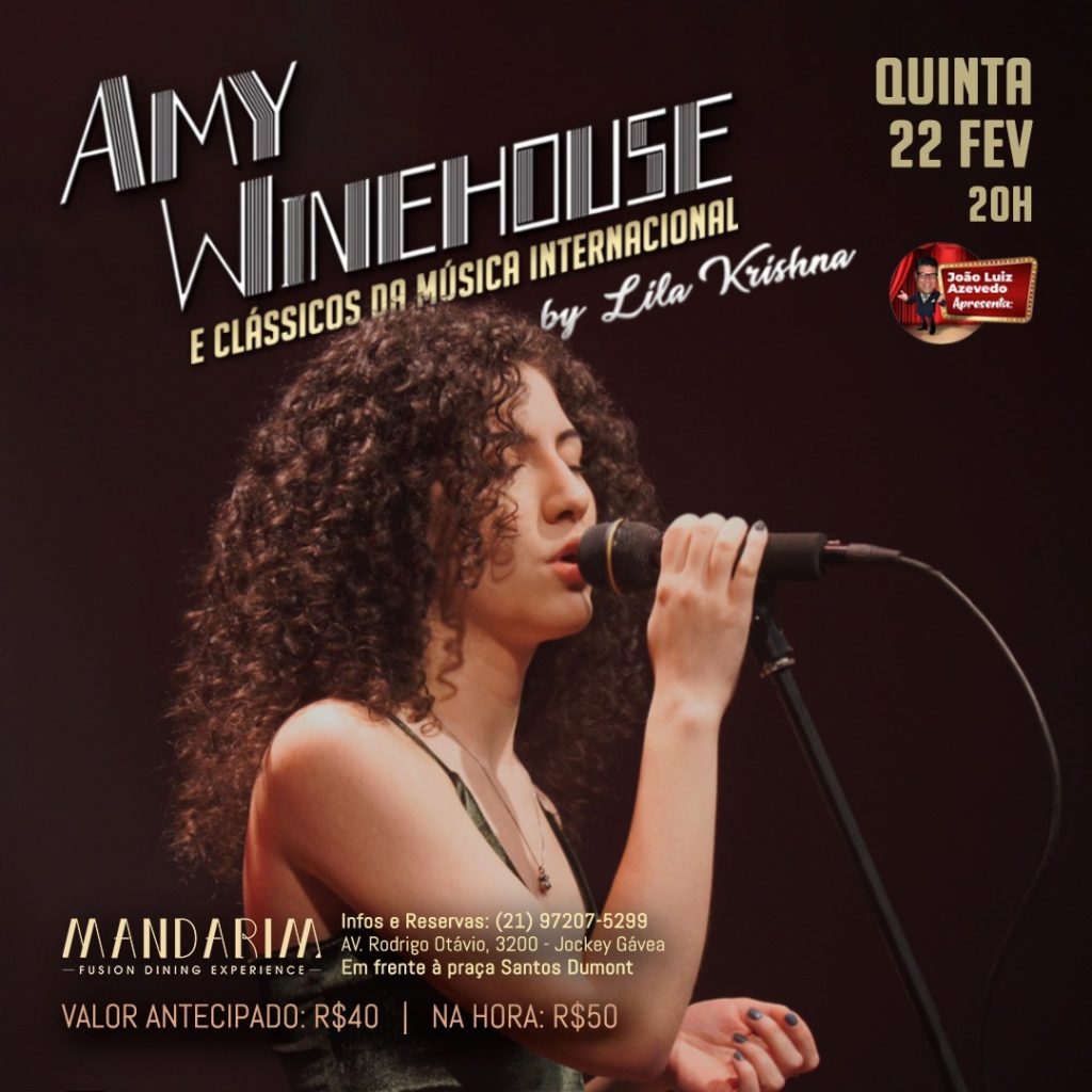 A cantora e compositora niteroiense Lila Krishna, de 26 anos, e o produtor João Luiz Azevedo apresentam nesta quinta-feira (22), às 20h, o show “Amy Winehoyse Tribute”, no Mandarim/Gávea.