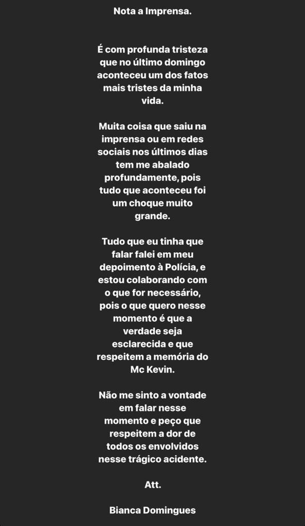 A mulher que estava no mesmo quarto que MC Kevin, Bianca Dominguez, de 26 anos, também usou as redes sociais nesta terça-feira (18), para falar sobre a morte do cantor. De acordo com o depoimento que prestou à polícia, ela estava dentro do quarto com o funkeiro e viu ele cair do Hotel Brisa Barra ao tentar escapar da esposa, com o objetivo de esconder a traição.