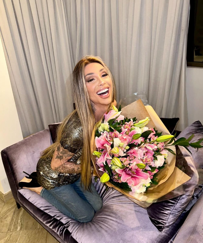 “Calma, estou saindo com um jogador de futebol. Não estou mais com aquele cara”, afirmou Maya Massafera, segurando um buquê de flores.