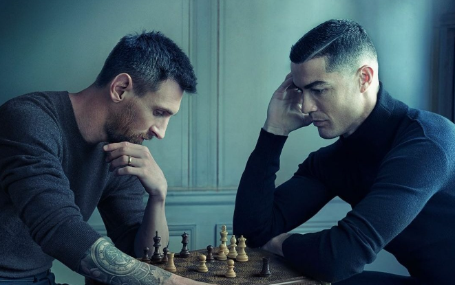 Desta vez, os craques Lionel Messi e Cristiano Ronaldo decidiram se enfrentar em um esporte diferente: o xadrez. A foto que registrou o momento foi publicada pelos dois craques em uma rede social e se trata de uma ação publicitária para a famosa marca francesa Louis Vuitton.