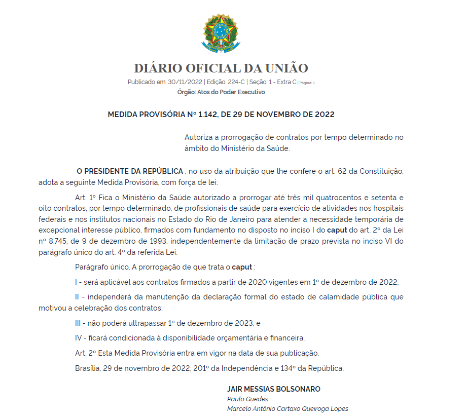 De acordo com a Medida Provisória, os contratos serão prorrogados até 1º de dezembro de 2023Um dia antes do fim do período de contrato com hospitais federais do Rio de Janeiro, o presidente Jair Bolsonaro sancionou uma Medida Provisória que prorroga o vínculo do Governo Federal com as unidades de saúde. A decisão, publicada nesta quarta-feira (30), no Diário Oficial da União, evita a dispensa de 2.583 funcionários que teriam os contratos encerrados encerrados.